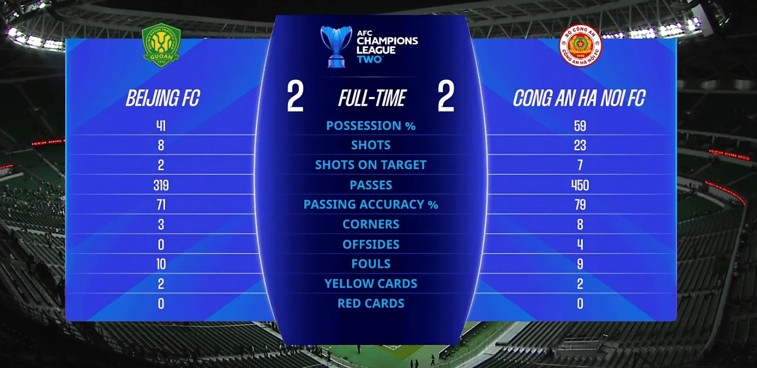 虎扑09月18日讯 亚冠二级联赛,北京国安2-2河内公安,本场比赛两队数据如下: